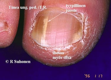 Jalkaterapeutin käynnit 6-8 viikon välein -> kynsien ohennus ja hionta parantaa hoitotuotteiden tehoa